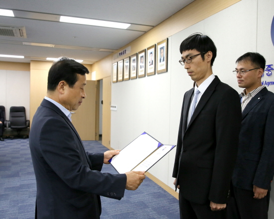 ▲ 이충재 행복청장(좌측)이 1일(월) 정부세종청사 종합관리상황실에서 2분기 행복창조대상 수상자들에게 상장을 수여한 뒤 단체 기념촬영을 하고 있다/ 충청뉴스 최형순 기자