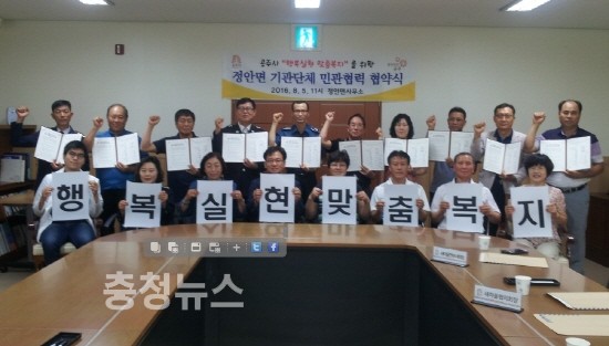 공주시 정안면(면장 최인종)이 맞춤형복지급여제도 시행 1년을 맞아 독거노인 등 취약계층에 보다 더 나은 서비스를 제공하기 위해, 지난 5일 정안면사무소에서 지역사회보장협의체 등 정안지역 18개 기관•단체장이 모여 민관 협력을 위한 협약을 체결했다.