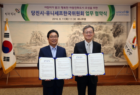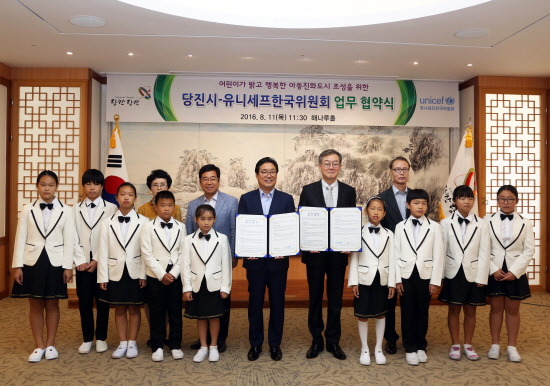 2017년 유니세프 아동친화도시(Child Friendly City) 인증을 목표로 하고 있는 당진시가 11일 시청 해나루홀에서 유니세프한국위원회와 ‘당진시-유니세프 간 아동친화도시 조성을 위한 업무협약’을 맺었다고 밝혔다.