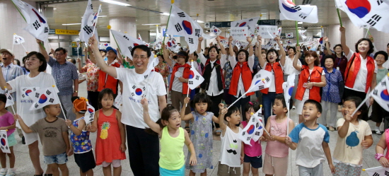 이어서, 나라사랑 태극기 사랑, 나라사랑 태극기 달기 등 구호와 함께 ‘독도는 우리 땅’ 노래가 울려 퍼질 때는 지하철을 이용하는 여러 명의 일반시민들도 플래시 몹에 동참하는 진풍경이 연출됐다.