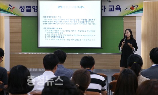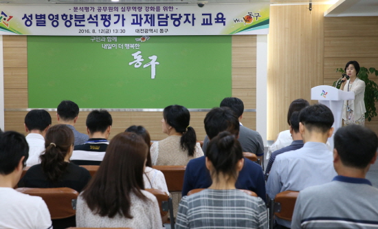 대전 동구(구청장 한현택)는 12일, 구청 중회의실에서 성별영향분석평가 과제 담당자 및 관계자 100여 명이 참석한 가운데 분석평가 공무원의 실무역량 강화를 위한 교육을 실시했다고 밝혔다.