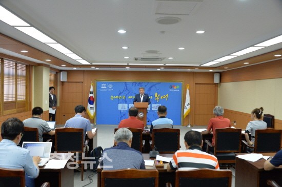 이용우 부여군수가 16일 부여군청 브리핑실에서 홍산 열병합발전소 시설 유치를 반대하는 기자회견을 가졌다.