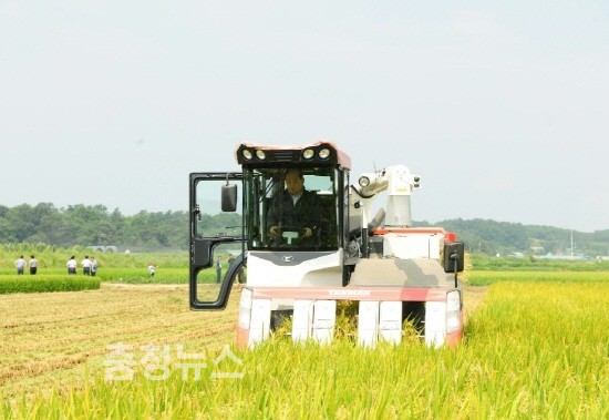 충남 예산군은 추석을 한 달여 앞둔 17일 예산군 고덕면 일원에서 올해 첫 벼 베기가 실시됐다고 밝혔다. 군에 따르면 이날 첫 벼 베기는 이동희(58․고덕면 호음삼봉길)씨가 고덕면 호음리 일원 4만㎡의 논에 재배한 고품질 극조생종 품종인 ‘조운벼’이다.
