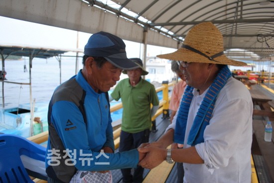 ▲ 폭염 피해를 입은 부석면 창리 가두리 양식장을 방문해 피해상황을 살피고 어업인들을 위로하고 있다.