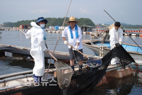 윤 부의장은 시름에 잠겨있는 어업인들을 격려하고, 피해 양식장에서폐사된 우럭을 뜰채로 걷어내는 봉사활동도 펼쳤다.