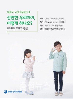 이날 강좌에는 충남대학교병원 정신건강의학과 김현진 교수가 강사로 나서 '산만한 우리아이, 어떻게 하나요?' 라는 주제로 강의를 펼치고 질의응답 시간을 가질 예정이다.