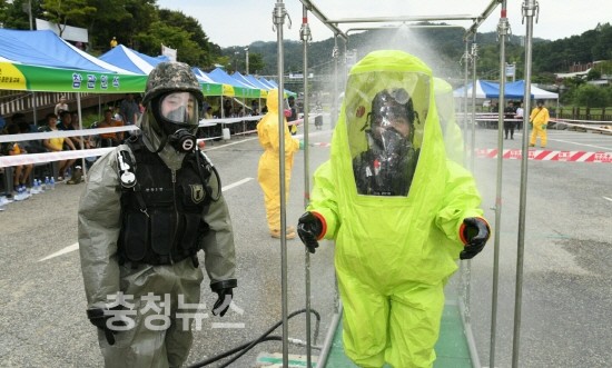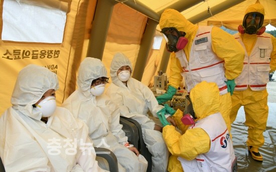 질병관리본부 참관 하에 실시된 이날 훈련에는 경찰서, 소방서, 대전응급의료센터, 505여단 5대대 및 금강유역환경청 등 12개 기관 100여 명이 참여했다.