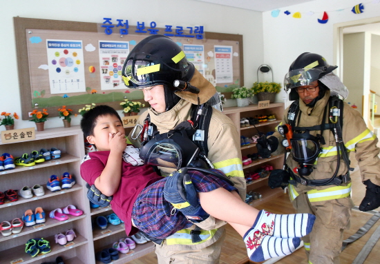 ▲ 대전 유성구가 24일 사이언스신성어린이집에서 2016 을지연습 실제훈련인 화재발생 및 구조훈련을 개최한 가운데, 119 구급대원이 어린이를 구조하고 있다