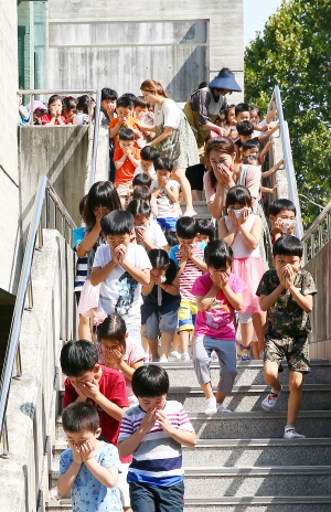 ▲ 대전 유성구가 24일 사이언스신성어린이집에서 2016 을지연습 실제훈련인 화재발생 및 구조훈련을 개최한 가운데, 어린이집 원생들이 질서 있게 화재를 대피하고 있다.