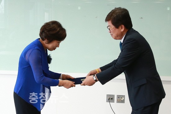 ▲ 최교진 교육감이 오는 9월 1일 신임 교육정책국장으로 발령을 받은 새롬중 박애란 교장에게 임명장을 수여하고 있다.