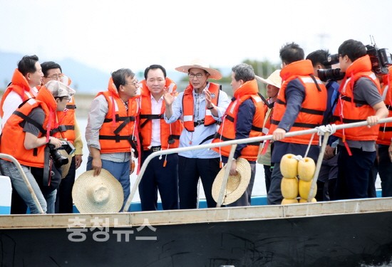 이정현 새누리당 대표가 27일 고수온으로 우럭이 집단 폐사한 서산시 및 태안군의 천수만 가두리 양식장을 방문했다.