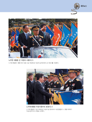지난 10월 1일 국군의 날 행사는 육·해·공군 통합으로 계룡대 연병장에서 노무현대통령 및 3부 주요인사, 각계 대표 그리고 국가유공자와 낙도어린이 일반시민 등 5천여명이 참석하여 명실공히 民·軍이 함께하는 최대의 축제임을 다시 한번 보여주었다.