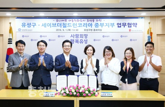 대전 유성구(구청장 허태정)는 1일 구청 중회의실에서 아동이 행복한 유니세프 아동친화도시 조성을 위해 120여개 국가에서 아동권리 실현을 위하여 활동하는 세이브더칠드런 코리아 중부지부(지부장 김미숙)와 ‘아동친화도시 조성을 위한 업무협약’을 체결했다고 밝혔다.