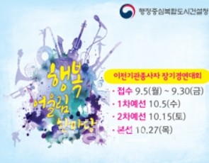 청은 다음달 10월 27일에 ‘제1회 행복어울림 한마당’을 개최할 예정으로, 다양한 장기를 가진 끼 있는 세종청사 및 국책연구기관 직원들의 많은 참여를 바란다고 밝혔다.