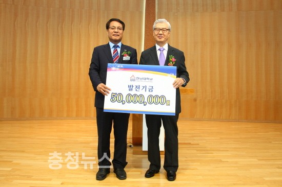 ▲ 한남대 이덕훈 총장(왼쪽)이 7일 학교법인 대전기독학원 이락원 이사장(오른쪽)에게 발전기금 5천만원을 기탁하고 있다.