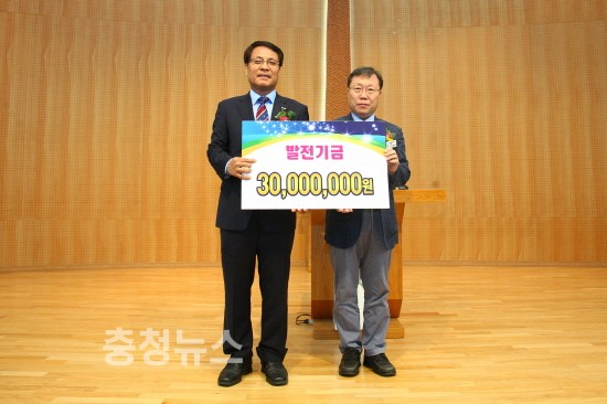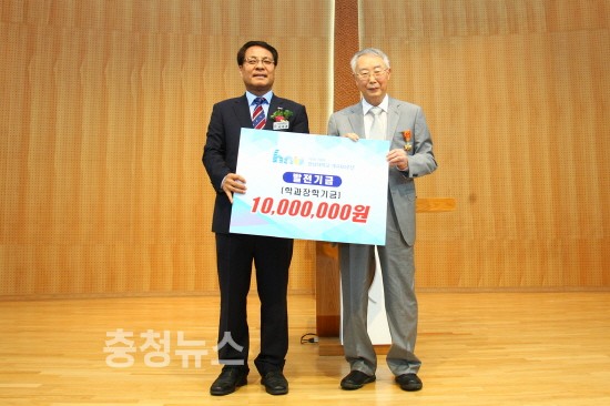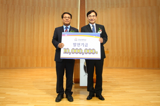 ▲ 한남대 임충식 산학협력부총장(오른쪽)이 7일 이덕훈 총장(왼쪽)에게 발전기금 1천만원을 기탁하고 있다.