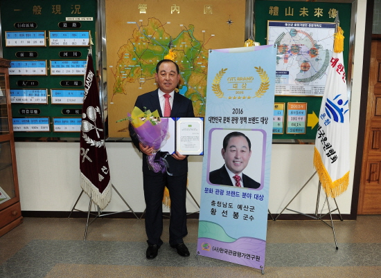 충남 예산군은 지난 7일 서울 프레스센터에서 열린 ‘2016 대한민국 문화 관광 정책 브랜드 대상 시상식’에서 대상을 수상했다고 8일 밝혔다.