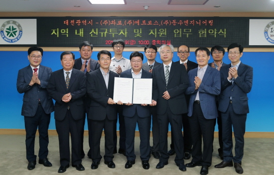 대전시가 9일 오전 시청 중회의실에서 지역 내 투자를 희망하는 ㈜와코, ㈜에르코스, ㈜동우엔지니어링 등 3곳의 기업과 신규투자에 대한 업무협약을 체결했다고 밝혔다.