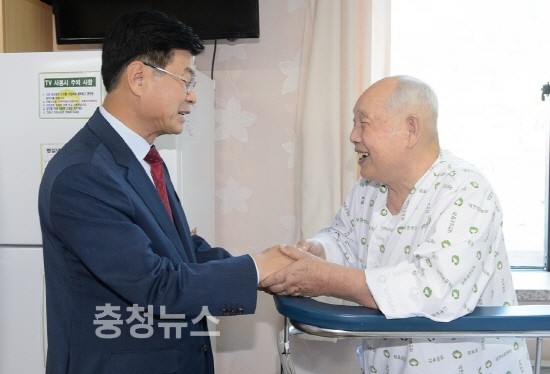 ▲ 이춘희 세종시장이 9일 대전보훈병원을 찾아 입원 치료중인 국가유공자와 이야기를 나누고 있다.