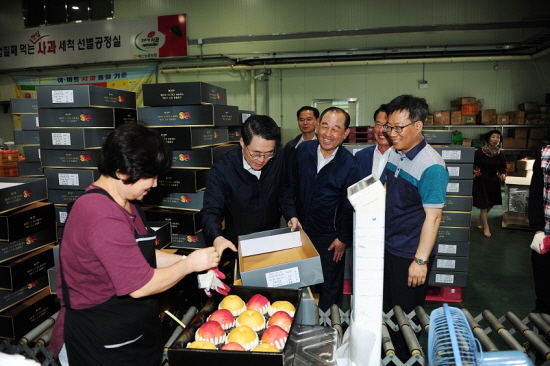 군에 따르면 이날 김재수 농식품부 장관은 추석을 맞아 선물용 사과의 출하 및 거래 동향을 점검하기 위해 예산농산물유통센터(예산군 신암면 용궁리)와 지역 내 사과 재배 농가를 방문했다.