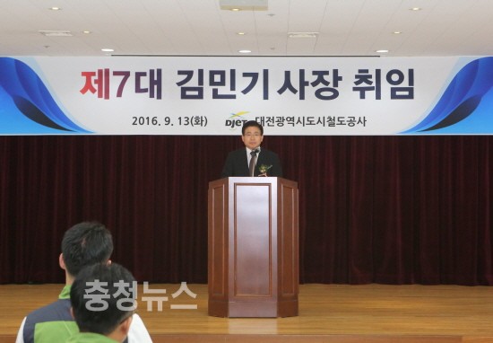 대전도시철공사 김민기 사장이 13일 공사 대강당에서 취임식을 갖고 3년 동안의 임기를 시작했다.