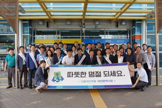 더불어민주당 대전시당이 13일 오후 서대전역에서 추석맞이 귀향인사를 진행했다.