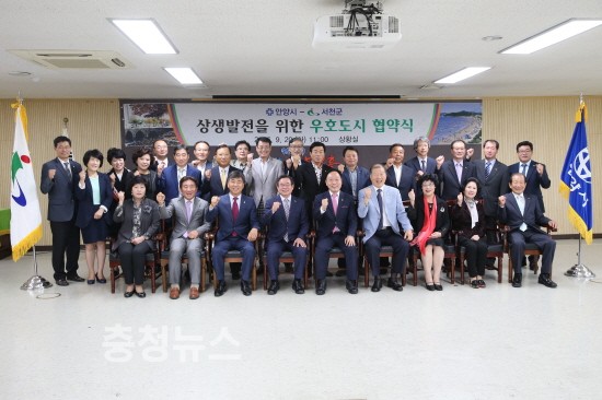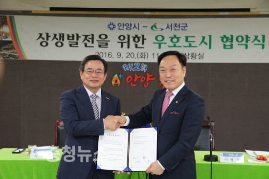 충남 서천군(군수 노박래)은 20일 안양시청에서 노박래 서천군수, 이필운 안양시장, 시․군의회 의장 및 의원 등 30여 명이 참석한 가운데 상호교류 및 상생발전을 위한 우호도시 협약을 체결했다고 밝혔다.