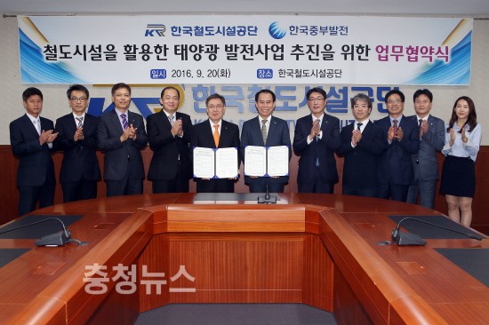 한국철도시설공단(이사장 강영일)과 한국중부발전(사장 정창길)은 정부의 ‘신재생에너지 보급 확대 및 산업육성’ 정책에 발맞추어 철도자산을 활용한 태양광 발전시설을 구축하기 위하여 9월 20일(화) 사업 공동추진을 위한 업무협약을 체결했다고 밝혔다.