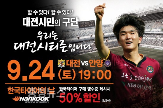 대전시티즌이 오는 24일 오후 7시 대전월드컵경기장에서 열리는 ‘현대오일뱅크 K리그 챌린지 2016’ 36라운드 안양과의 경기에 ‘한국타이어의 날’을 개최한다고 밝혔다.