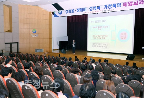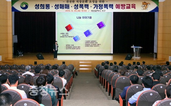 대전 서구(구청장 장종태)는 20일 구청 대강당에서 장종태 서구청장을 비롯해 직원 400여 명이 참석한 가운데, 성희롱․성매매․성폭력․가정폭력 예방 직장교육을 했다고 밝혔다.