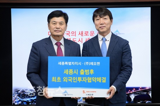 세종특별자치시(시장 이춘희)가 20일 시청 집현실에서 이춘희 시장과 강철수 ㈜제오젠 대표 등이 참석한 가운데 외국자본 투자협약을 체결했다고 밝혔다.