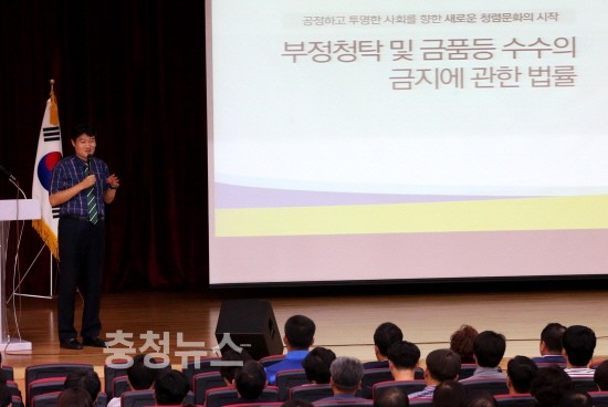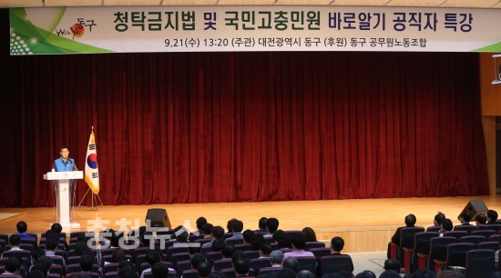 대전 동구(구청장 한현택)는 21일, 구청 공연장에서 공직자 400여 명이 참석한 가운데 ‘부정청탁 및 금품 등 수수의 금지에 관한 법률(이하 부정청탁 금지법)’ 일명 김영란법에 대한 특별 교육을 실시했다고 밝혔다.