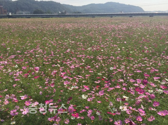 충남 천안시 풍세면 소재 시도1호와 시도3호 교차지점(남관교 부근)에 1만2000㎡ 규모로 조성된 꽃동산 코스모스가 만개하여 장관을 이루며 오가는 이들의 마음을 사로잡고 있다고 밝혔다.