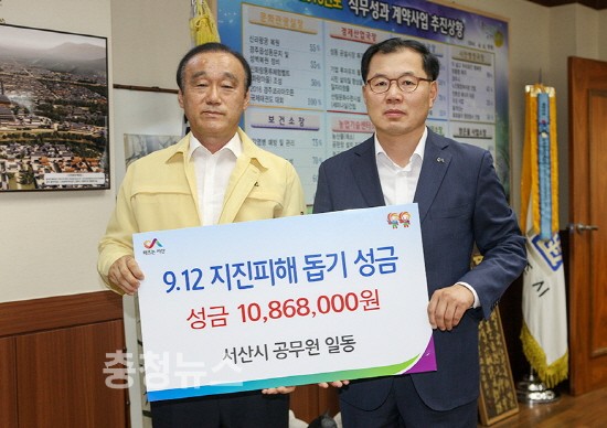 충남 서산시청 직원들은 23일 자발적으로 모금한 성금 10,868천원을 지진 발생으로 피해를 입은 경주시에 기탁했다고 밝혔다.