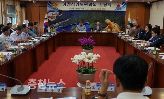 청양군의회(의장 이기성)의원과 이장상임위원단 간담회가 23일 군청 상황실에서 열렸다.