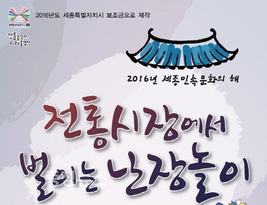 세종시는 국립민속박물관과 공동 주관하는 ‘2016 세종민속문화의 해’사업의 일환으로 지역 4대 전통시장에서 풍물, 봉산탈춤, 줄타기, 공연체험 등 다양한 난장놀이를 추진한다.