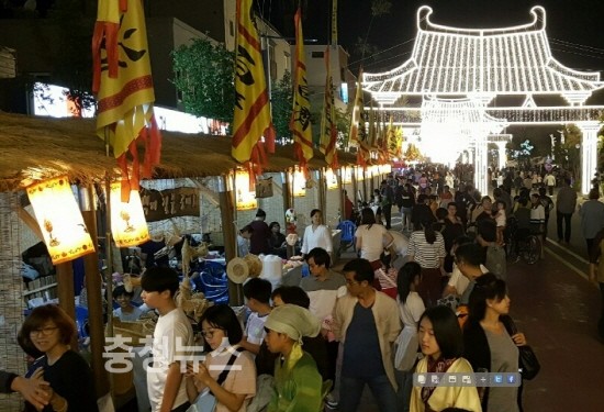 백제문화제 개막일인 24일 오후에는 관람객들이 정림사지 일원과 석탑로, 이색창조거리, 백마강달밤시장에 모여들어 인산인해를 이어갔다.
