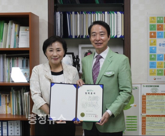 ▲ 장학금 전달식 모습(왼쪽부터 조신형 본부장님, 유미 관장님)