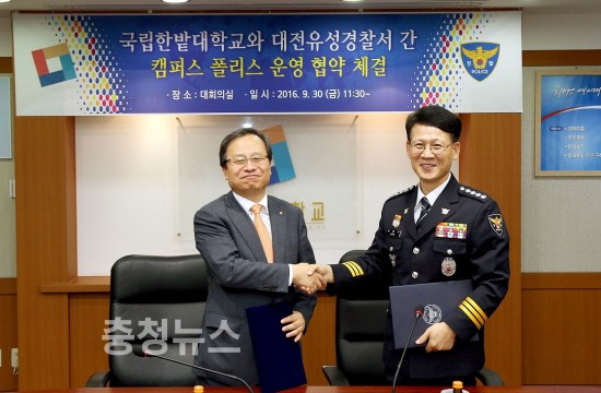 한밭대학교 총장 송하영은 대전유성경찰서와 30일(금) 오전 11시 대회의실에서 캠퍼스 폴리스(campus police) 운영을 위한 업무협약을 체결했다고 밝혔다.