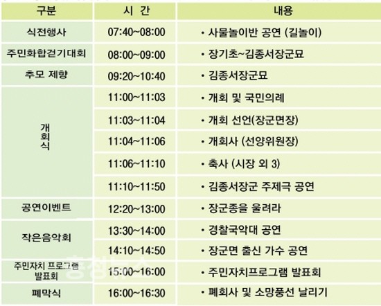 박덕규 장군면장은 “세종대왕이 가장 신임했던 김종서 장군의 호국정신을 배우고 기리는 역사문화 축제가 될 수 있도록 그동안 차질없이 준비했다.”며 많은 관광객의 방문을 당부했다.