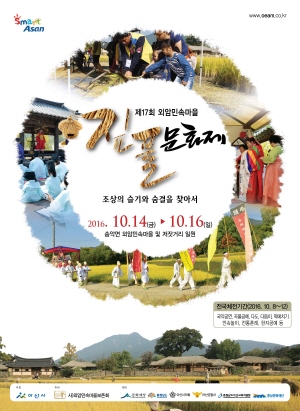 그리고 2016전국체전과 연계하여 2016. 10. 8~ 10. 12까지 외암민속마을 및 저잣거리 일원에서 국악공연, 곡물공예, 다도․다듬이․떡메치기, 민속놀이, 전통혼례, 한지공예 등이 개최된다.