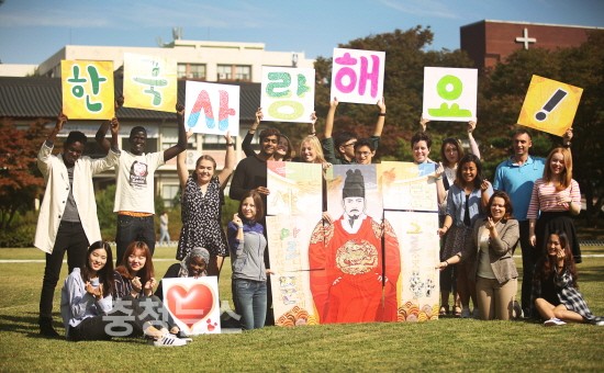 ▲ 외국인 학생들이 한남대 사범대학 앞 잔디밭에서 세종대왕 그림과 ‘한국 사랑해요!’ 라는 글씨를 들고 포즈를 취하고 있다. /사진제공:한남대