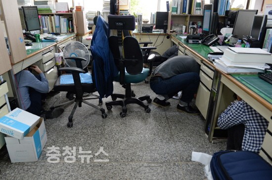 이에 홍성군청 직원들은 재난에 스스로 대처할 수 있는 대응능력을 기르고자 사무실 책상 및 테이블 밑으로 대피하는 실내대피, 가방 등으로 머리를 보호한 후 안전지역으로 이동하는 실외대피 등 실제 상황과 같은 긴박한 상황 속에서 지진대응 훈련에 임하였다.