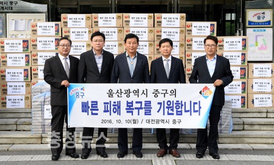 대전 중구(박용갑 구청장)는 10일 제18호 태풍 ‘차바’의 최대 피해지역 중 하나인 울산 중구의 수해복구 지원을 위해 생필품과 함께 덤프트럭과 운전요원을 현지로 파견했다고 밝혔다.