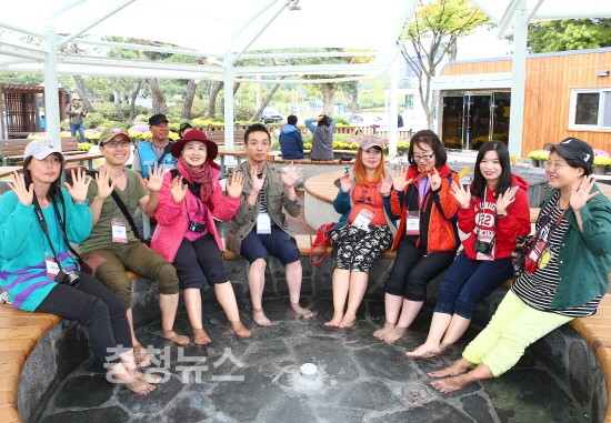 ▲ 11일 팸투어에 참여한 파워블로거들이 한방족욕카페를 방문해 발을 담그고 온천을 체험하고 있다