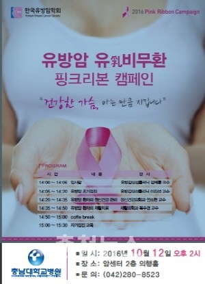 충남대학교병원(원장 김봉옥)은 오는 12일 암센터 2층 의행홀(박종윤·전지민 홀)에서“건강한 가슴, 아는 만큼 지킵니다.”라는 주제로 유방암 핑크리본 캠페인을 진행한다고 밝혔다.