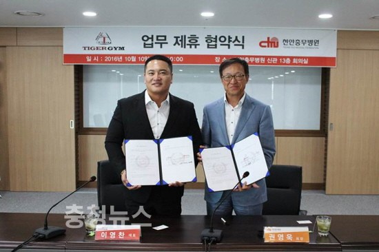 천안 타이거짐(대표 이영찬)은 10일 천안 충무병원(회장 권영욱)과 ‘업무제휴 협약’을 통해 앞으로 병원과 협력하여 한차원 높은 퍼스널 트레이닝을 진행할 계획이라고 밝혔다.