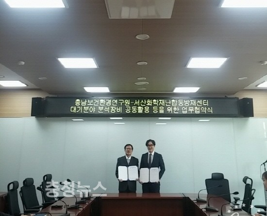 충남도 보건환경연구원(원장 이재중)은 11일 연구원 회의실에서 서산화학재난합동방재센터(센터장 배종수)와 ‘대기분야 분석 장비 공동 활용 등을 위한 업무협약’을 체결했다고 밝혔다.