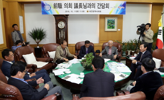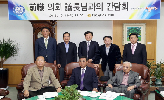 대전시의회(의장 김경훈)가 11일 대전시의회 의장실에서 1991년 대전직할시의회 개원 이후 초대 김두형 의장을 비롯한 7명의 역대 의장을 초청, 현안사항을 논의하는 ‘소통의 시간’ 을 가졌다.