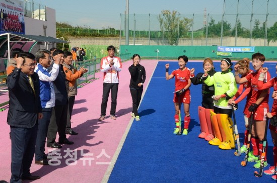아산시의회(의장 오안영)는 10일 제97회 전국체전이 열리고 있는 아산학선하키장을 찾아 아산시청과 평택시청의 경기를 응원하고 선수단을 격려 했다.